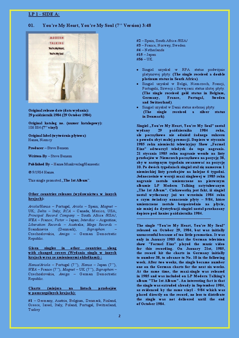 Początkowo wydawało się, że wytwórnia słusznie zachowuje sceptycyzm, ponieważ początkowo singiel sprzedał się powoli. W każdy poniedziałek publikowane były nowe listy sprzedaży, a ja z tygodnia na tydzień liczyłem na cud. „You're My Hert, You're My Soul” wszedł do sprzedaży w październiku 1984 roku, a do grudnia sprzedanych było zaledwie 6 000 singli. Na tamte czasy to było zupełnie nic. Obecnie byłoby to miejsce pod pierwszą 20 na liście przebojów. Jednak wtedy potrzeba było co najmniej 40 000 sprzedanych singli, żeby w ogóle wejść na listę. Na początku grudnia 1984 roku byliśmy od tego bardzo daleko.