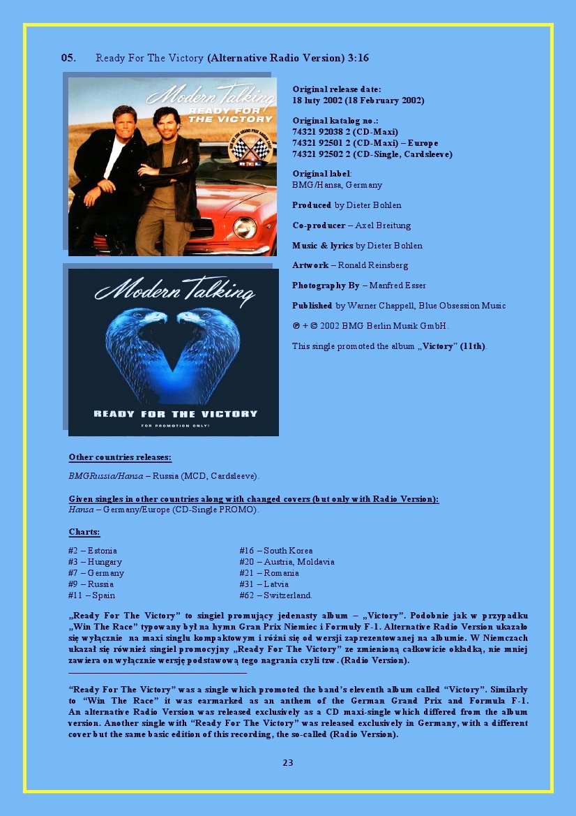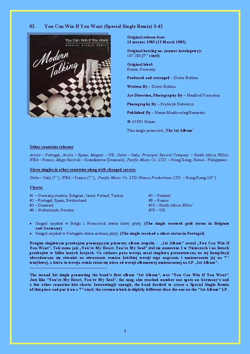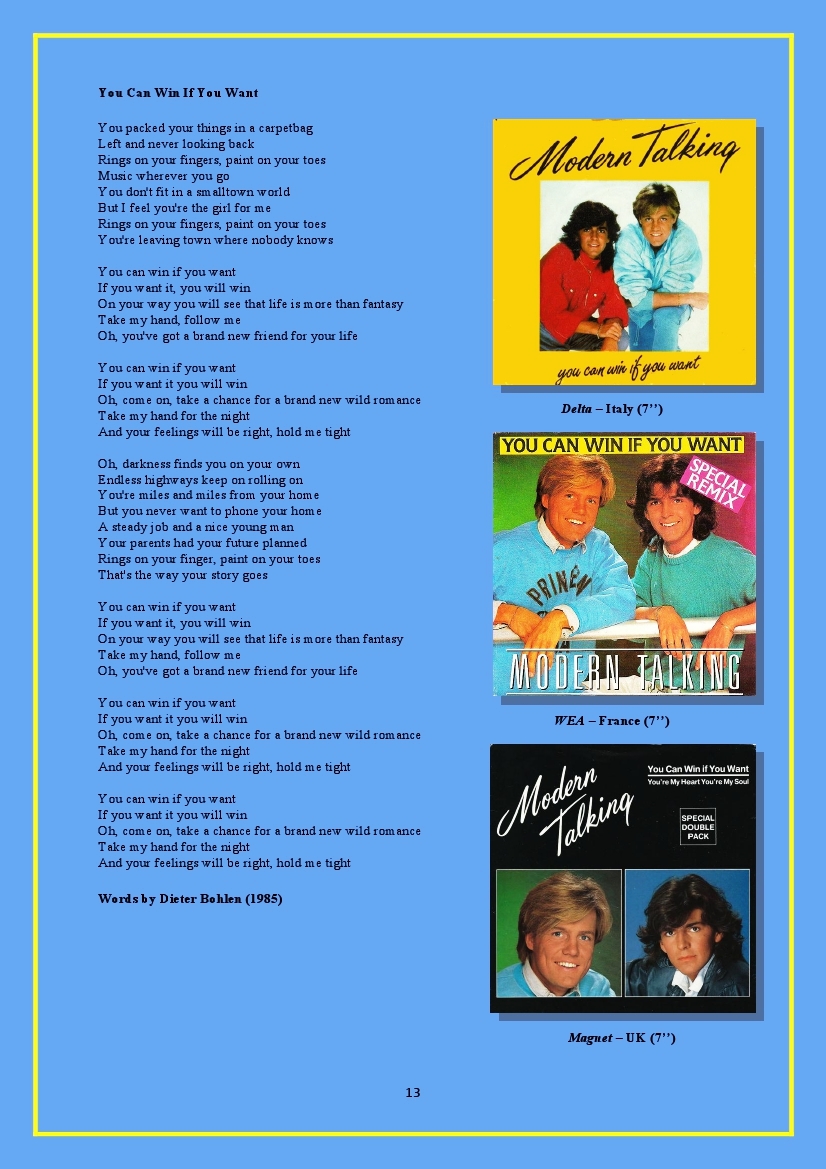 Modern Talking tygodniami było na „Szczytach list przebojów” w Niemczech, i niespodziewanie również za granicą. Codziennie przychodziły nowe prośby promocyjne. Dieter i ja żyliśmy jak we śnie. Numer jeden w całej Europie. „The First Album” ukazał się w Niemczech i również osiągnął szczyt. Został wydany nasz drugi singiel „You Can Win, If You Want” i wylądował... no... też na pierwszym miejscu.