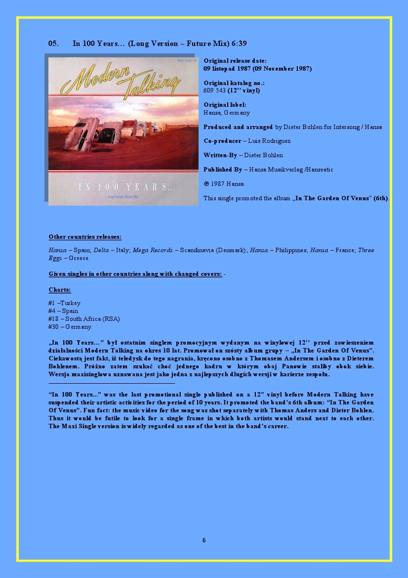 Ostatnim singlem Modern Talking I było „In 100 Years”, a video kręciliśmy w Monachium w Bavaria-Studios. Oddzielnie! Wytwórni rzeczywiście udało się zaplanować zdjęcia tak, żebyśmy Bohlen i ja podczas nagrania nie wchodzili sobie w drogę. Każdy z nas miał swoje dni zdjęciowe i swój plan, pojedyncze sekwencje zostały zmontowane później w studiu. Mogę powiedzieć tylko, wielkie dzięki wspaniałemu światu techniki! Potem już nie widziałem Dietera Bohlena i nie rozmawiałem z nim, do 1993 roku.