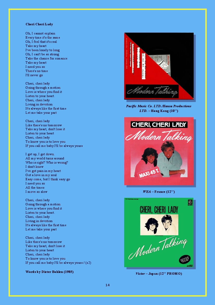 Jako demo miałem w domu piosenkę, która nie wychodziła mi z głowy: „Cheri Cheri Lady”. Lekka i prosta, jednak dawała mi po prostu dobre samopoczucie. Dieter wysyłał mi zawsze od 40 do 50 piosenek na nowy album, a ja wybierałem, tak że zostawało jakieś 20 tytułów. Z tego Dieter wybierał później jeszcze raz 12, 13 piosenek, które ja potem nagrywałem w studiu. „Ej Dieter”, zawołałem go, „dlaczego wyrzuciłeś Cheri Cheri Lady?” „Uważasz tą piosenkę za dobrą?”, zapytał. „serio? No, to weźmiemy ją z powrotem.” „Cheri Cheri Lady” miało stać się jednym z naszych największych hitów. Ta piosenka i album znów stały się bezdyskusyjnym numerem jeden. Brak mi słów, żeby opisać, jak nadzwyczajnie i niezwykle wszyscy odczuwaliśmy ten niewyobrażalny sukces. Jednak można porównać tą sytuację z graczem w lotto, który co kwartał miałby szóstkę. Absolutnie nierealne!