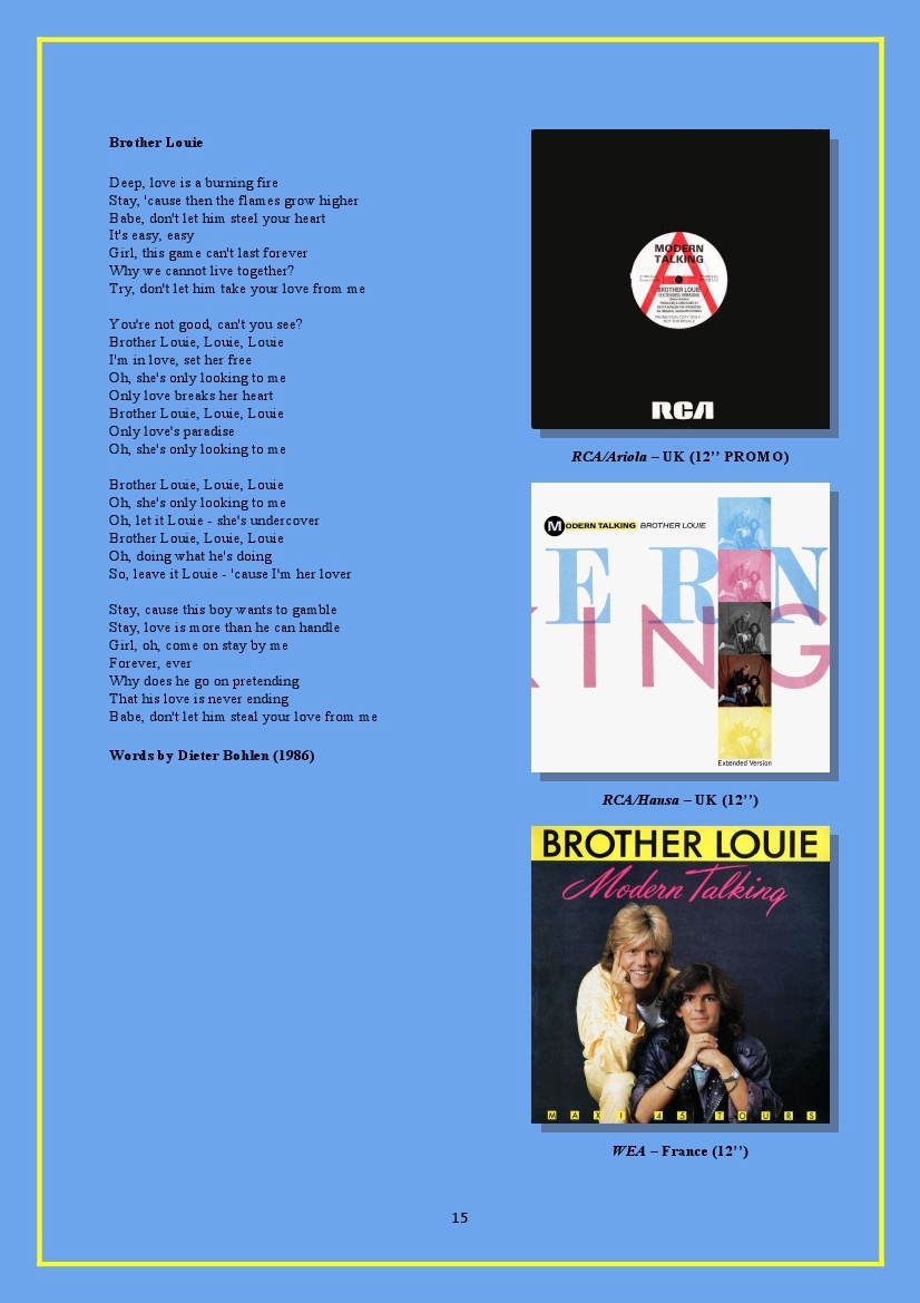 Petra Schumann, ówczesna sekretarka szefa Hansy, zastanawiała się nad nazwą dla nas. Na liście przebojów był właśnie brytyjski zespół Talk Talk odnoszący wielki sukces ze swoimi piosenkami w tylu elektropop. Był też zespół o nazwie Talking Heads. Tak więc Petra stworzyła nazwę zespołu „Modern Talk”. Dieter i ja uważaliśmy to za nie zły pomysł, lecz wytwórnia płytowa uważała, że „Modern Talking” brzmi bardziej przekonująco dla duetu. Tak to wyglądało. Następnie przeszliśmy do tworzenia okładki. Tylko żadnych twarzy, mieliśmy pozostać anonimowi.