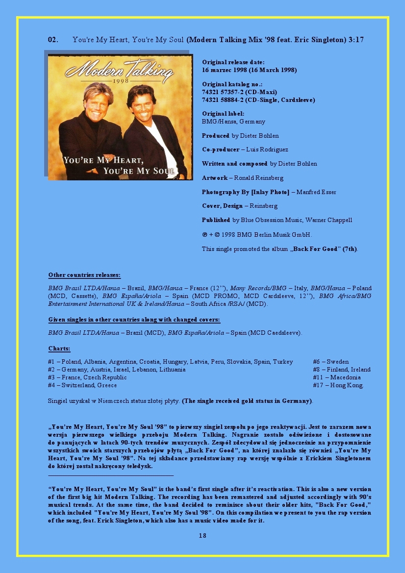 We wszystkich naszych Show w ciągu minionych lat naszym bisem za każdym razem był tytuł „You're My Heart, You're My Soul”. Kupowany przez miliony ludzi a przez jeszcze wielu więcej ludzi pokochany. Wszystko jedno, czy było „Cheri Cheri Lady”, „Brother Louie”, „You are Not Alone”- publiczność czekała na koniec każdego jednego występu na „You're My Heart, You're My Soul”. Dieter wiedział, jak my wszyscy, że po „You're My Heart...” ostatni koncert dobiegnie końca. Definitywnego końca! Przecież nie raz w takiej sytuacji udawało mu się przemóc i zrobić dla ludzi coś dobrego.