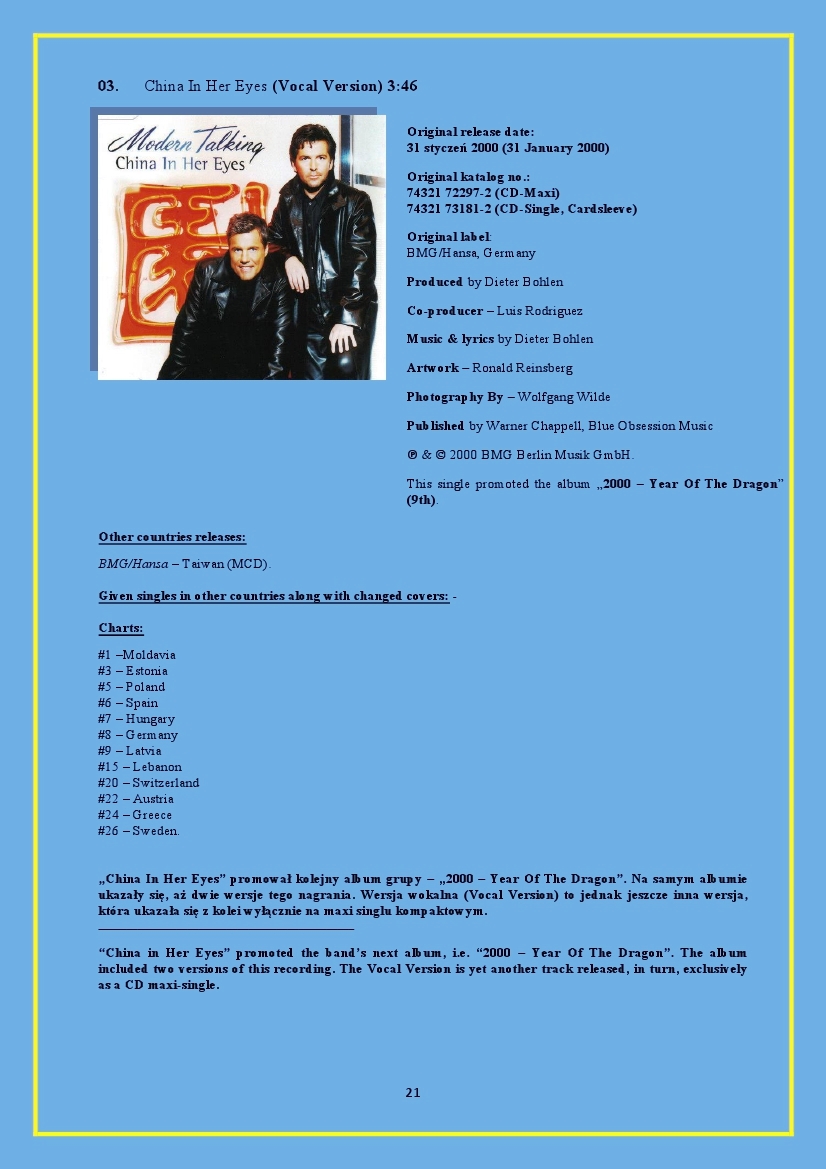 Czas mijał dosłownie jak szalony. Za naszym przebojowym albumem „Back for Good” podążył następny album nr.1 „Alone” a w roku 2000 „Year of the Dragon”. Pierwszym oddzielnym singlem był „China in Her Eyes”, do którego teledysk został nakręcony w Hongkongu. Przy wcześniejszych nagraniach zawsze towarzyszyła nam ekipa SAT.1 pod kierownictwem Ralfa Hermersdorfera. Kręcili dla telewizji materiały o Modern Talking, a SAT.1 nadawało specjalne programy i osiągali z nami wysokie wyniki. To była typowa sytuacja, w której wszyscy zyskują. Pomijając to, praca z ekipą była łatwa i przyjemna, szczególnie z Ralfem.