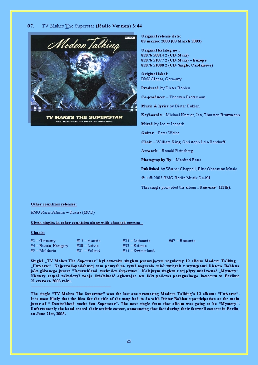 Modern Talking miał koncert we Wiedniu. W garderobie Dieter po raz pierwszy szczegółowo opowiedział mi o „Deustchland sucht den Superstar”. Że będzie jurorem w jednym konkursie talentów, który przyszedł z Anglii i dzięki któremu Simon Fuller stał się bardzo popularny. Jednak nie wie, czy to była dobra decyzja, bo nie potrafi oceniać i nie wie czy program odniesie sukces. Miał też potem produkować zwycięzcę i już martwił się tym, że teraz wiele weekendów będzie musiał siedzieć w jury. Patrząc z perspektywy nie wierzę Dieterowi w żadną z tych rzeczy. W tą niepewność i to zastanawianie się. On zawsze chciał spróbować konfrontacji. Jego opinia zależy od chwili, kiedy o czymś mówi, to z tysiąc procentową pewnością. Tej samej jesieni ukazała się też jego książka „Nic tylko prawda”. Oczywiście, że najpierw dowiedziałem się o tym z mediów.