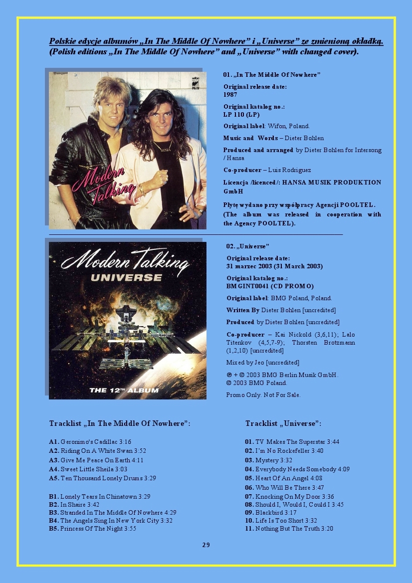Wytwórnia płytowa i my, a więc Dieter i ja mieliśmy rozmowę o przyszłości Modern Talking. Czasy stawały się trudniejsze, a sprzedaż ogólnie spadała. Albumu „Alone” sprzedaliśmy jeszcze prawie trzy miliony, a „Year of the Dragon” jeszcze ponad dwa, jednak w przyszłości te liczby nie były utrzymywane. Był już zaplanowany album na 2003 rok, a w 2004 miał być nawet wydany podwójny album na 20-lecie. ZDF obiecało już duży dokument o Modern Talking i występ w „Wetten, dass...”. Jedna połowa podwójnego albumu miała składać się z hitów, które fascynowały przez minione 20 lat a druga połowa z nowych piosenek. Na 2005 była planowana idea „Modern Talking spotyka klasykę”. Hity Modern Talking w klasycznej szacie i nowym brzmieniem mojego głosu. Nad 2006 nikt nie chciał jeszcze wtedy myśleć. Jednak wszystkie te pomysły były bardzo konkretne i konsekwentnie do nich zmierzano. W grudniu 2002 roku stanąłem w studiu i nagrałem album „Universe”.